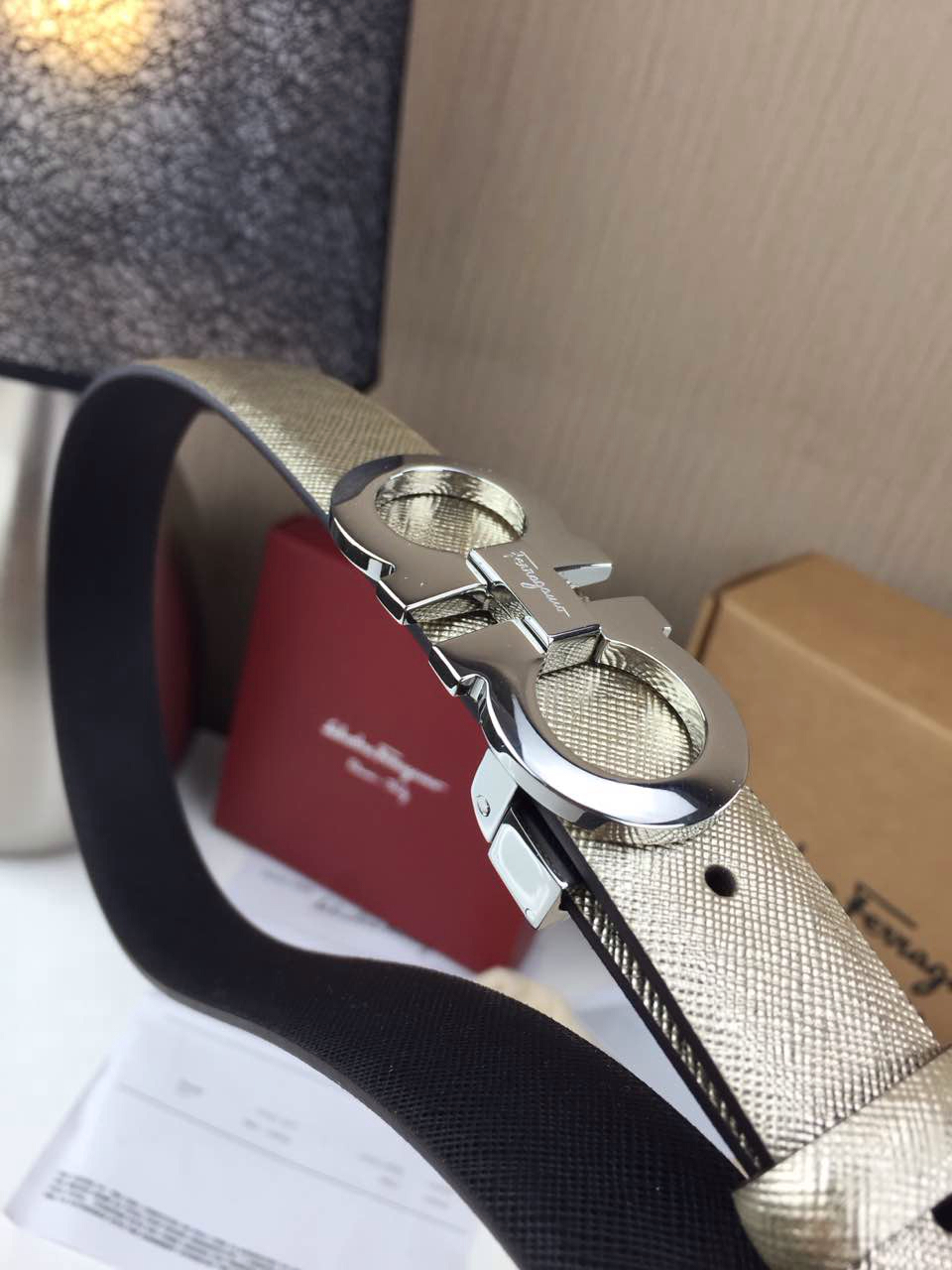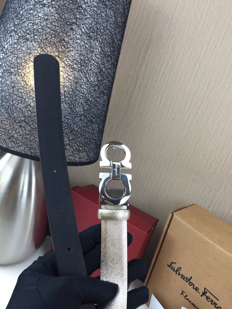 Ferragamo 菲拉格慕 女款 扣头金银两色可选 带身意大利十字纹牛皮 黑色配香槟金 双面可用 带宽2.5
