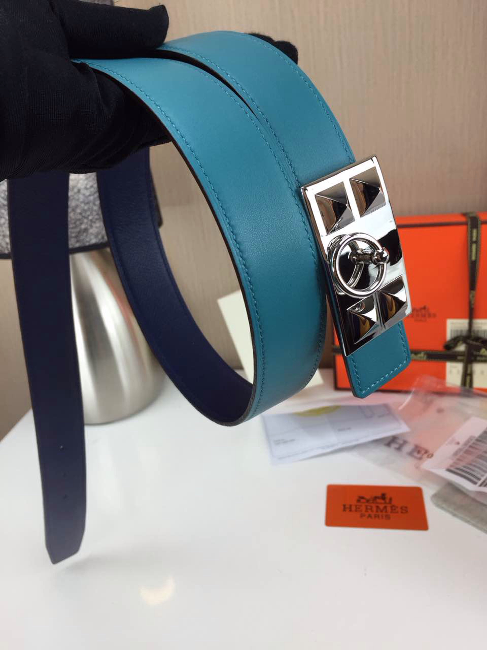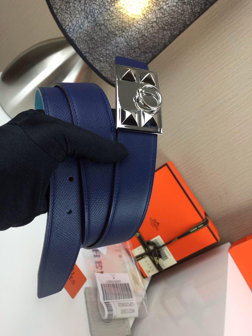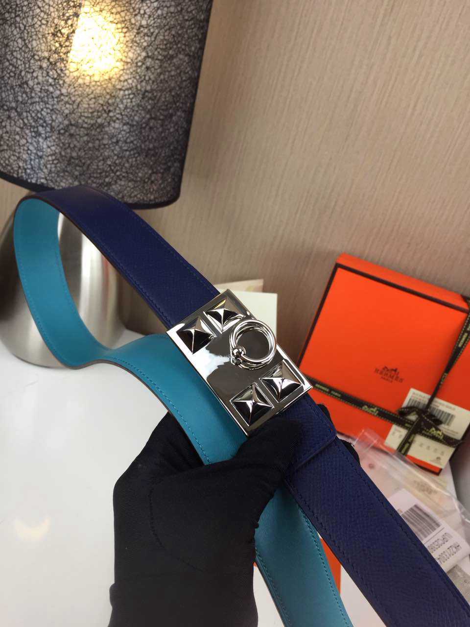 Hermes 爱马仕 新款门板扣 宝蓝掌纹配湖水蓝平纹 双面进口皮 宽3.2CM 男女通用