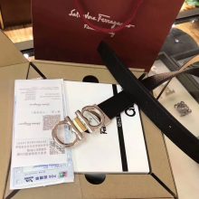 Ferragamo 菲拉格慕 女款 扣头金银两色可选 带身意大利十字纹牛皮 黑色配香槟金 双面可用 带宽2.5